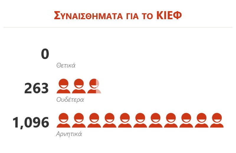 Το query “ΚΙΕΦ” κατέγραψε στο ελληνικό διαδίκτυο, σύμφωνα με το σύγχρονο εργαλείο για Web & Social Listening και Analytics PaloPro 1.361 συνολικές αναφορές για τη χρονική περίοδο 25– 29 Μαΐου 2019. Ο μεγαλύτερος όγκος των αναφορών προέρχεται από το Twitter, το οποίο και καθορίζει τις τάσεις της ελληνικής διαδικτυακής κοινής γνώμης. Ταυτόχρονα, τα συναισθήματα των αναφορών εμφανίζουν υπερκυριαρχία αρνητικών, ακολουθεί μικρός αριθμός ουδέτερων, ενώ απουσιάζουν τα θετικά συναισθήματα.